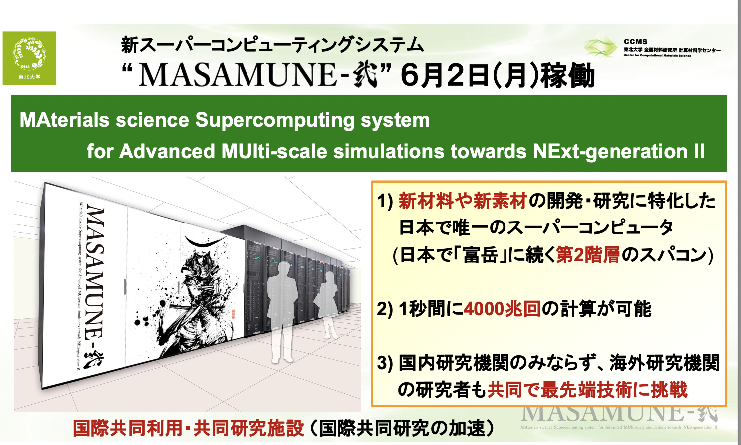 この「MASAMUNE-弐」は国内研究機関のみならず、海外研究機関の研究者とともに最先端技術開発に挑戦するための国際共同利用・共同研究施設を目指している。まさに、仙台から世界を目指した伊達政宗公の精神を継承しているスーパーコンピューティングシステムだ。