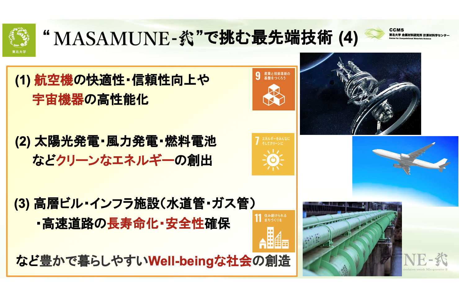 久保センター長は「『MASAMUNE-弐』の研究活動は、SDGs(持続可能な開発目標)の達成に直接的に貢献するものとなっています」と「MASAMUNE-弐」が切り拓く最先端の研究の可能性を強調する。「航空機の快適性・信頼性向上、エンジンの高性能化による燃費改善、太陽光発電・風力発電・燃料電池などクリーンエネルギーの創出、高層ビル・インフラ施設・高速道路の長寿命化と安全性確保など、現代社会が直面する重要課題の解決に取り組んでいます。」