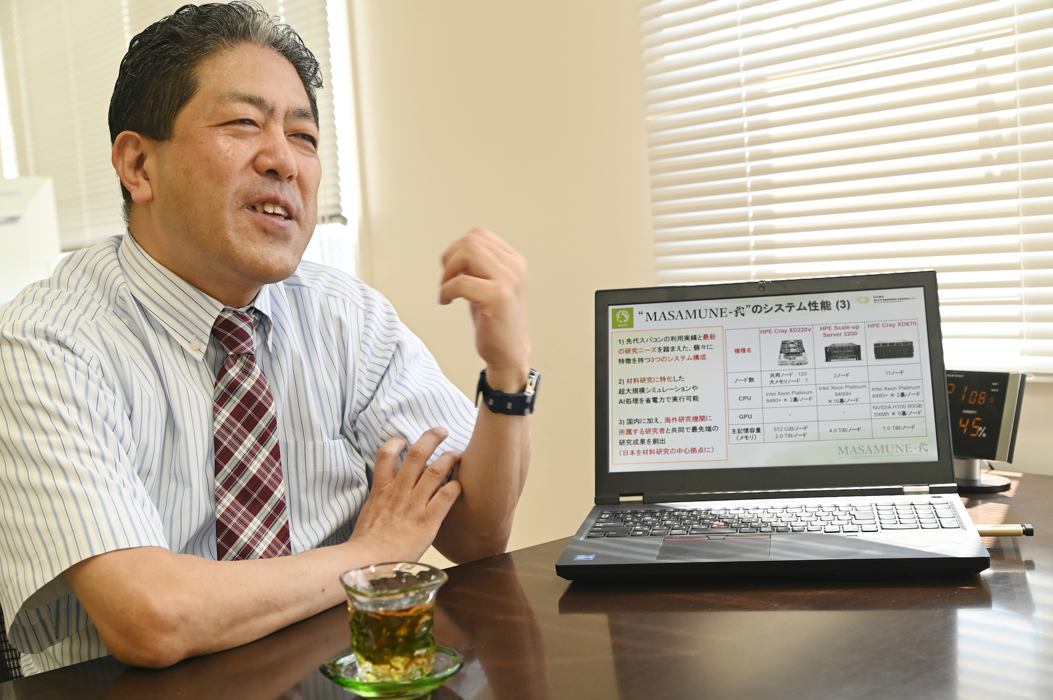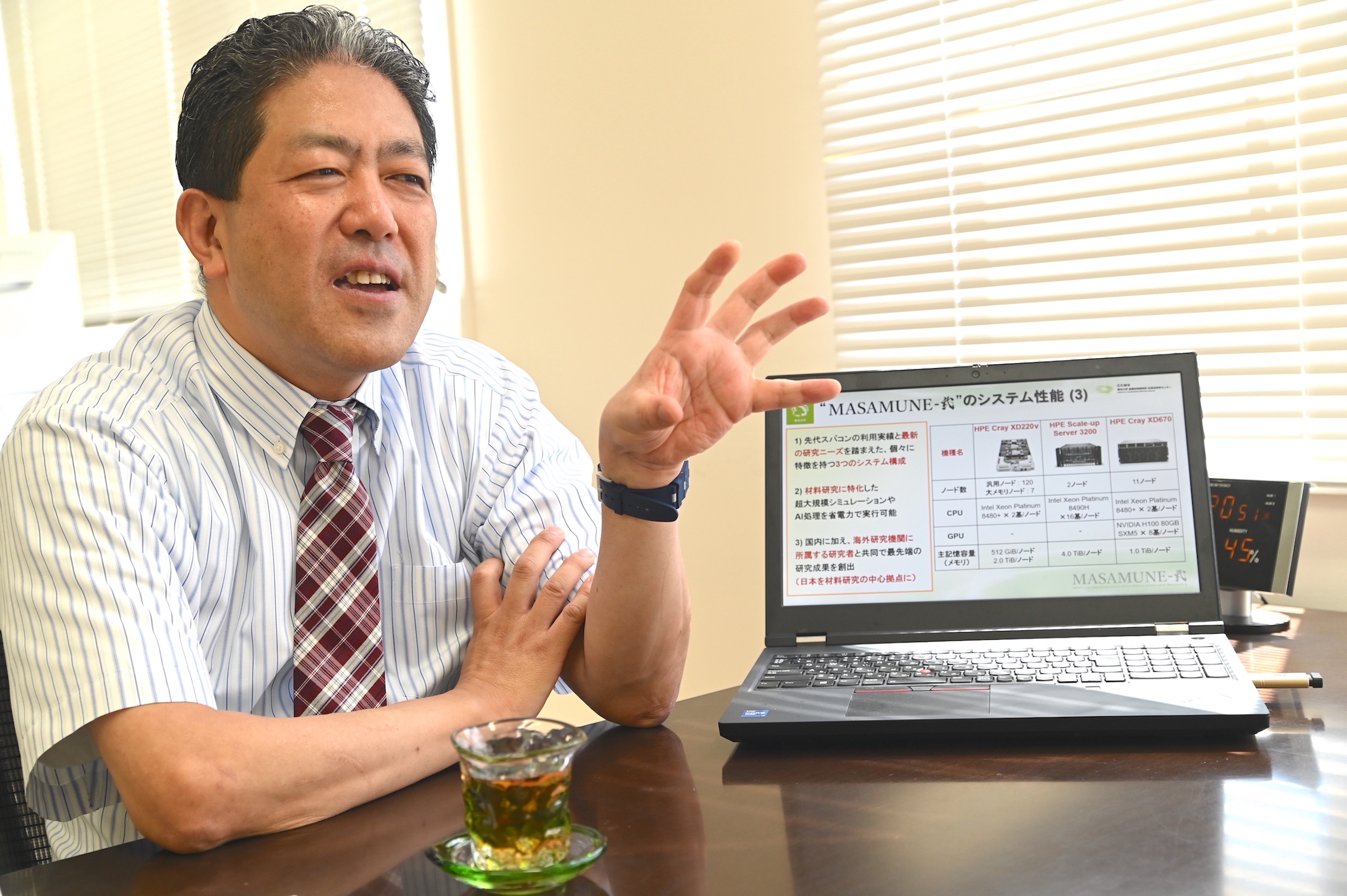 「新たに稼働したこの『MASAMUNE-弐』は新材料や新素材の開発・研究に特化した日本で唯一のスーパーコンピュータです。1秒間に15桁×15桁の計算を4000兆回実行することが可能で、日本のフラッグシップスーパーコンピュータ「富岳」を頂点とするスーパーコンコンピュータの階層構造の中で、第2階層に位置するスーパーコンピュータ群の1つに位置しています」と話す久保センター長。