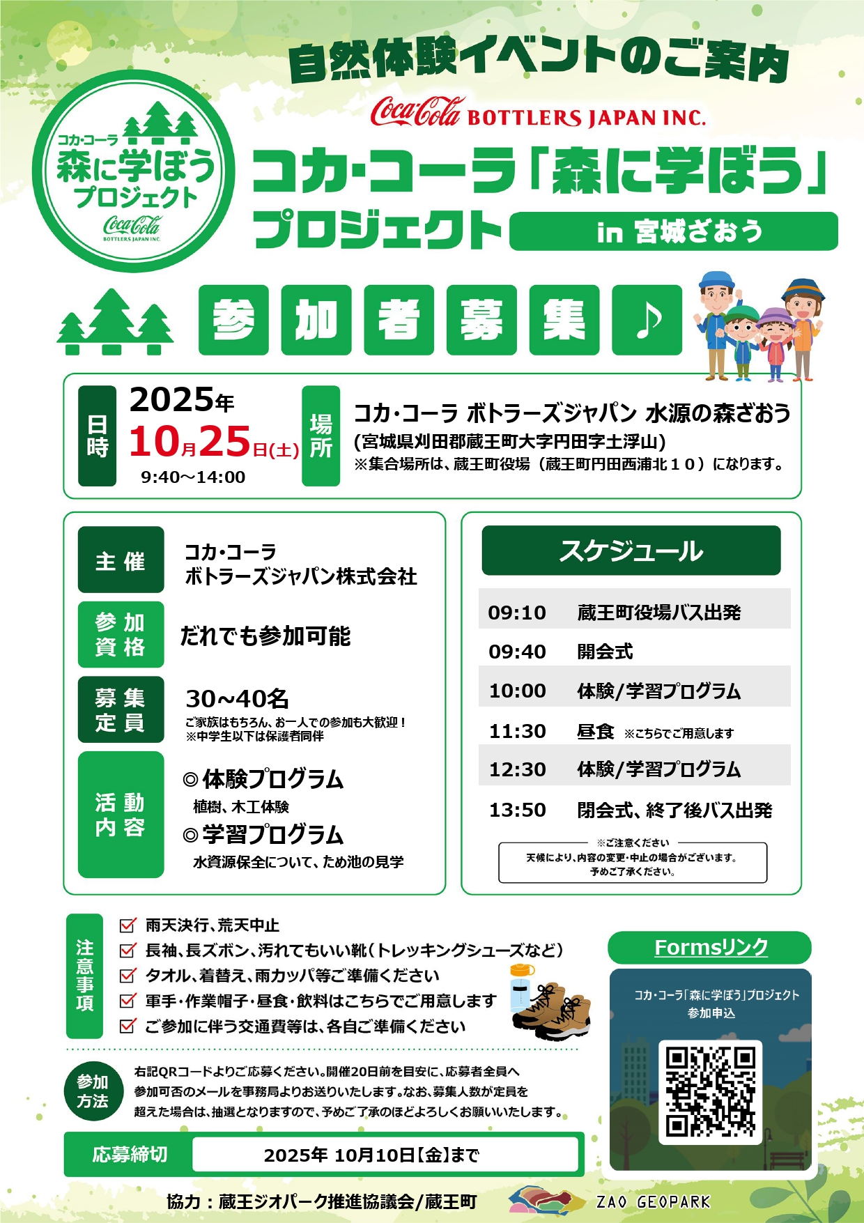 【コカ・コーラ ボトラーズジャパン株式会社】10/25(土)コカ・コーラ「森に学ぼう」プロジェクトin宮城ざおう 参加者募集!