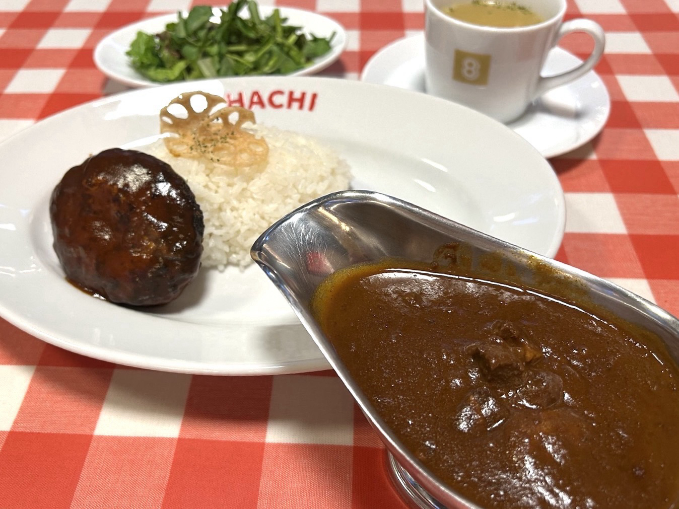 今回の提携第1弾として、11月1日よりハチ食品の「蜂カレー」とレストランHACHIのハンバーグトッピング等アレンジしたコラボメニューを特別価格で提供する。