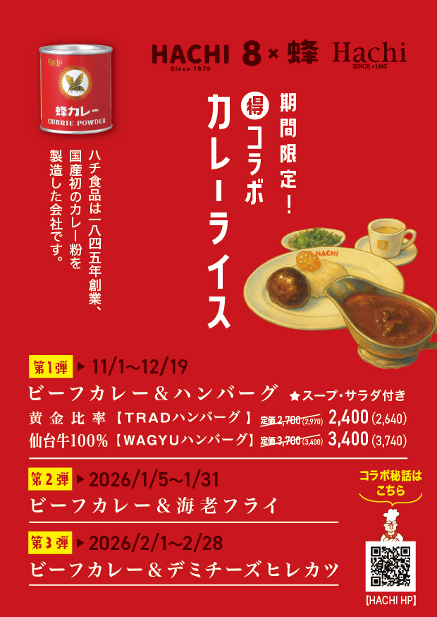 レストランHACHIは1979年創業、名取・仙台エリアに6店舗を構え、名物「黄金比率ハンバーグ」やカゴメ ナポリタングランプリ🄬で日本一になったナポリタン等の洋食メニューで多くのファンを持つ。一方、ハチ食品は1845年創業、1905年には国産初のカレー粉を製造するなど、カレーブランド「蜂カレー」で長年日本の食文化を支えてきた企業。