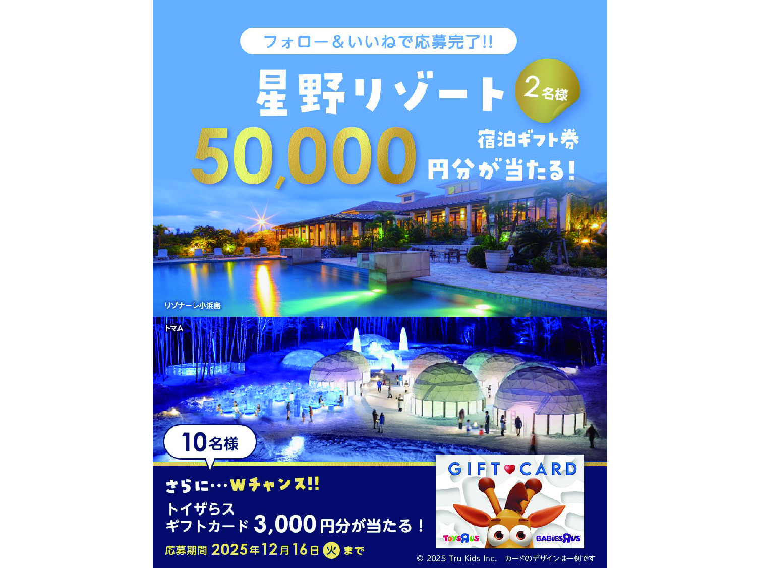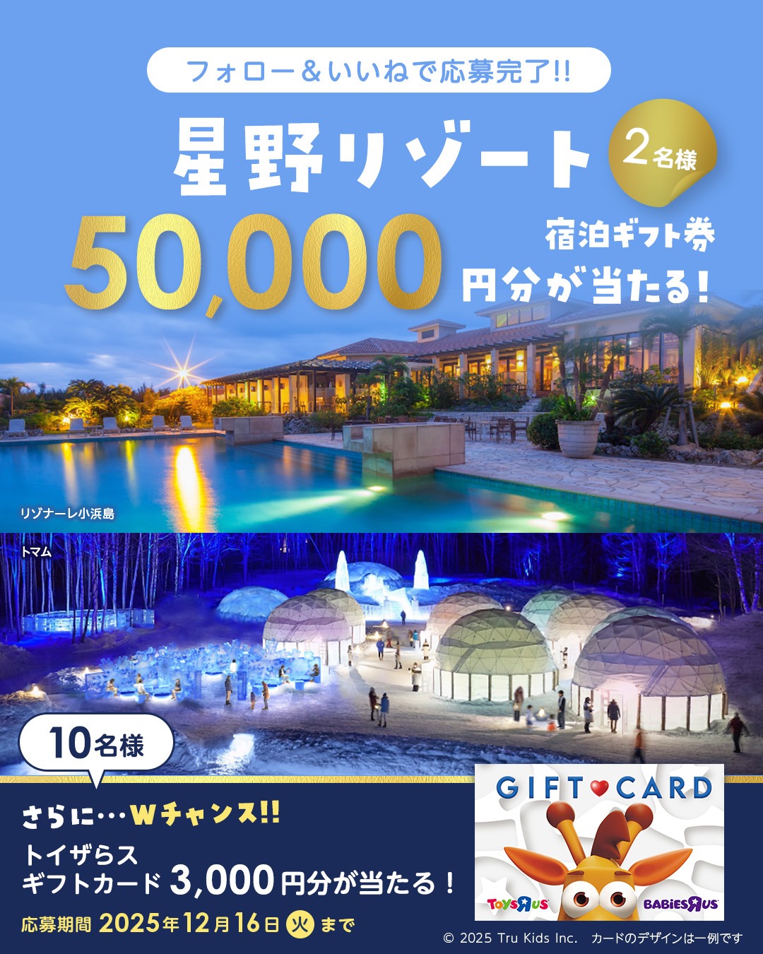 今回は、”家族で冬を楽しもう♪”をテーマに、星野リゾート宿泊ギフト券50,000円分を2名様、トイザらスギフトカード3,000円分を10名様にプレゼント。応募方法は、セイバン公式Instagramのフォローおよびキャンペーン投稿への“いいね”で完了。