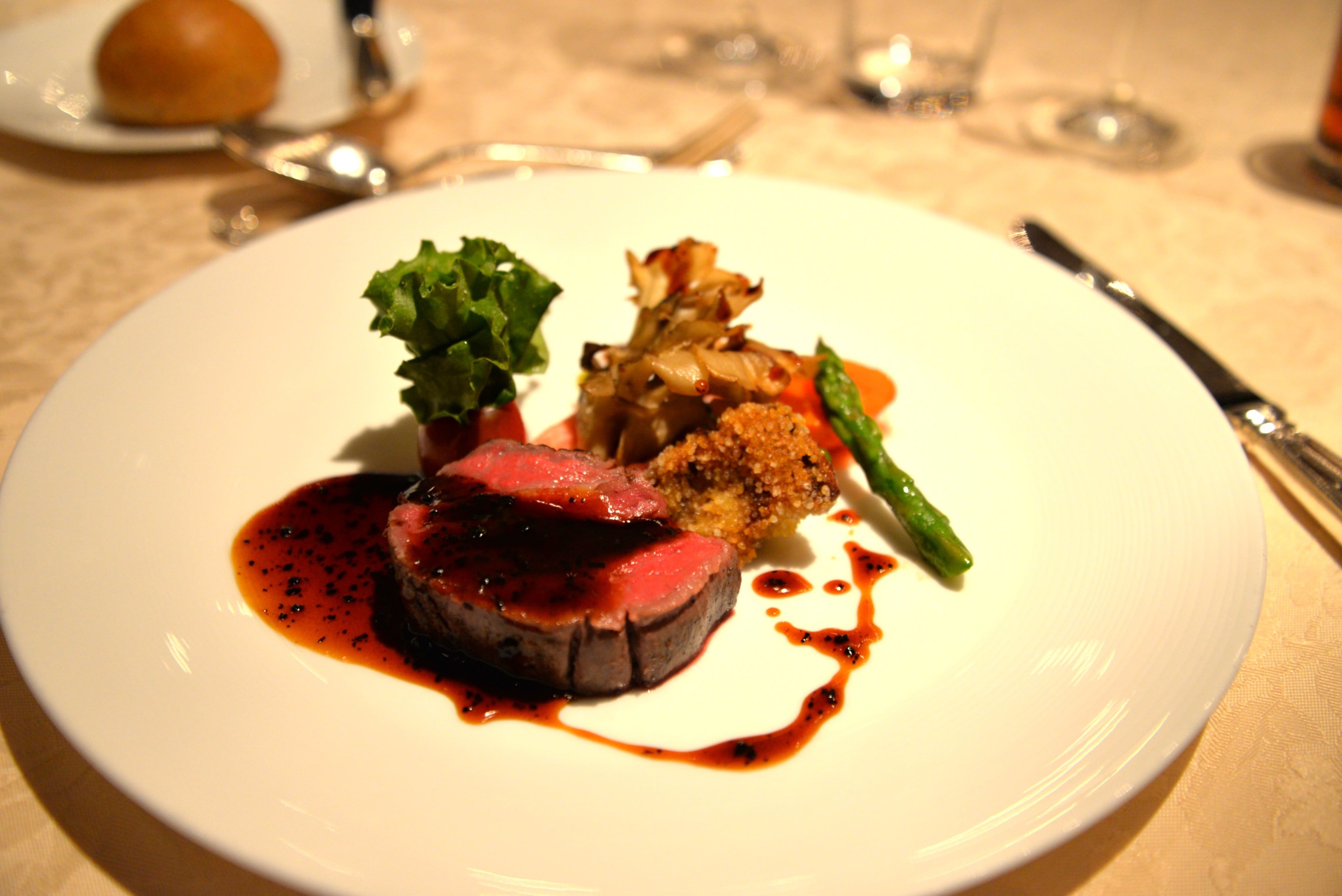 メニューは、前菜のタラバカニと野菜のテリーヌや、寒い冬にぴったりなビーフコンソメスープのパイ包み焼きなど。中でも注目は、幸せを運ぶ牛 山形県の「幸生牛」を使ったヒレ肉のロースト。赤身の旨味が堪能でき、さっぱりとした美味しさとなっている。