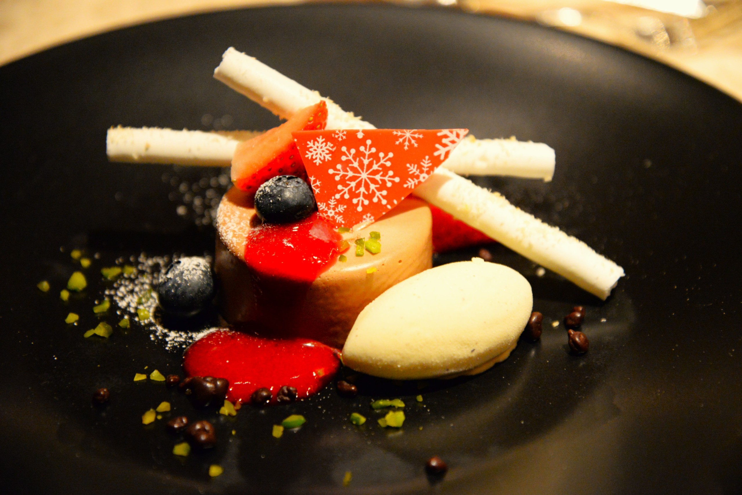 デザートにはチョコレートとキャラメルのムースをメインに、パチパチと弾けるキャンディーをチョコレートでコーティングした飾りも施された遊び心も。